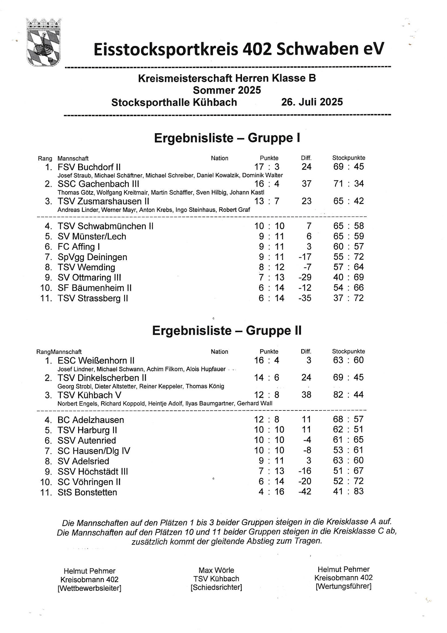 An der diesjährigen Meisterschaft am 26. Juli in Kühbach belegten die Stockschützen Werner Besel, Felix Besel, Christoph Wagner und Josef Neubauer in der Gruppe 1 den 7. Platz.