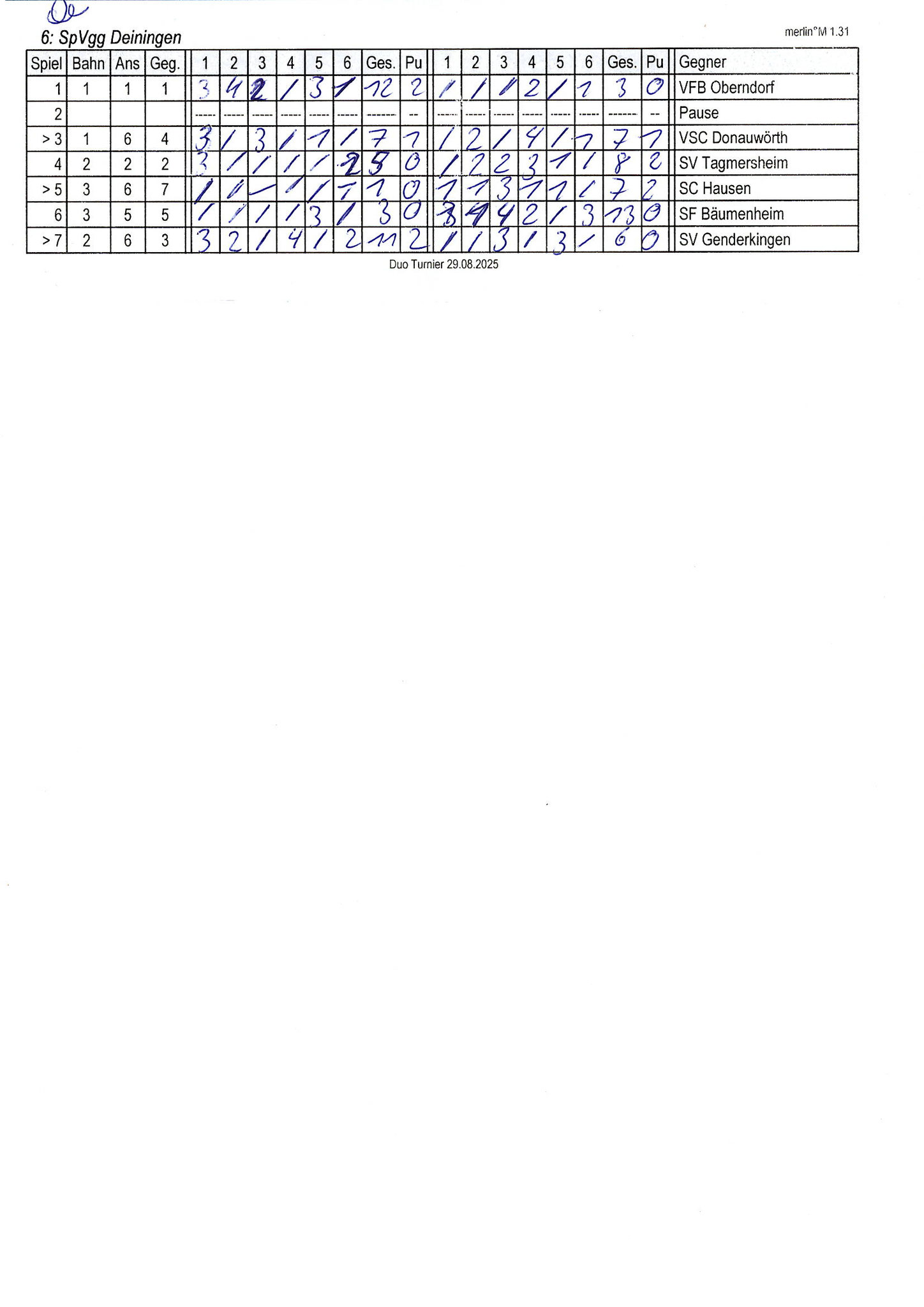 Beim DUO Turnier des FSV Buchdorf belegte die Mannschaft der SpVgg Deiningen, bestehend aus Werner Besel und Felix Besel am Ende den 6. Platz.