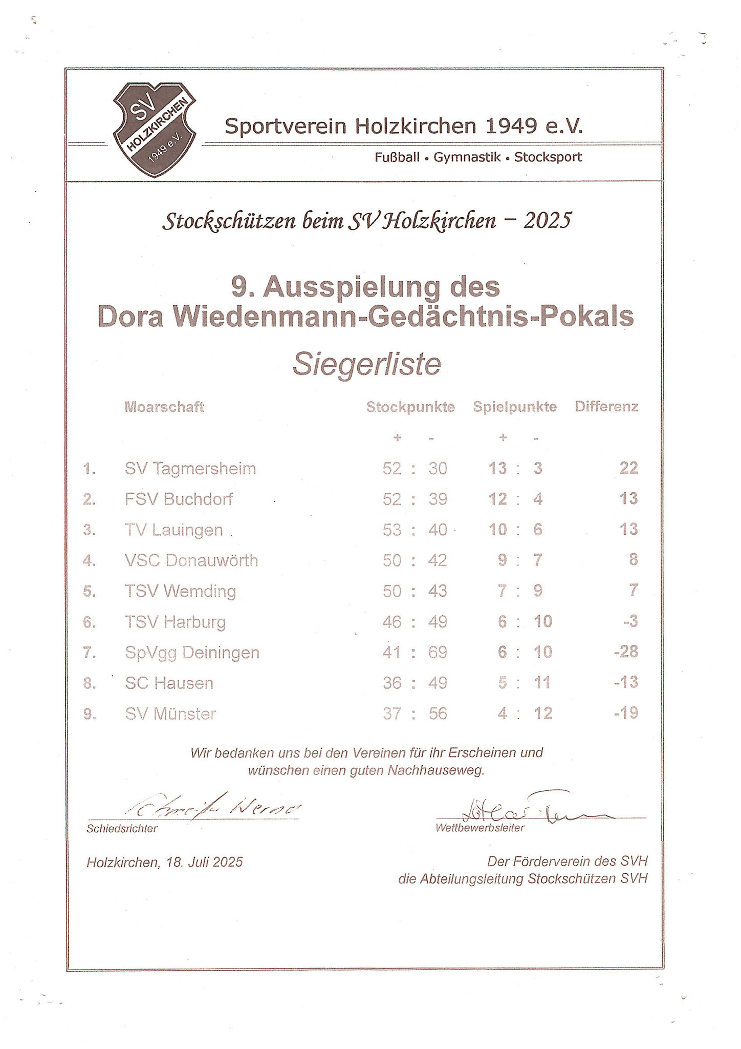 In diesem Jahr fand in Holzkirchen zum 9. mal die Ausspielung des Dora-Wiedenmann-Gedächtnis-Pokals statt. Bei diesem Turnier nahmen insgesamt 9 Mannschaften teil.