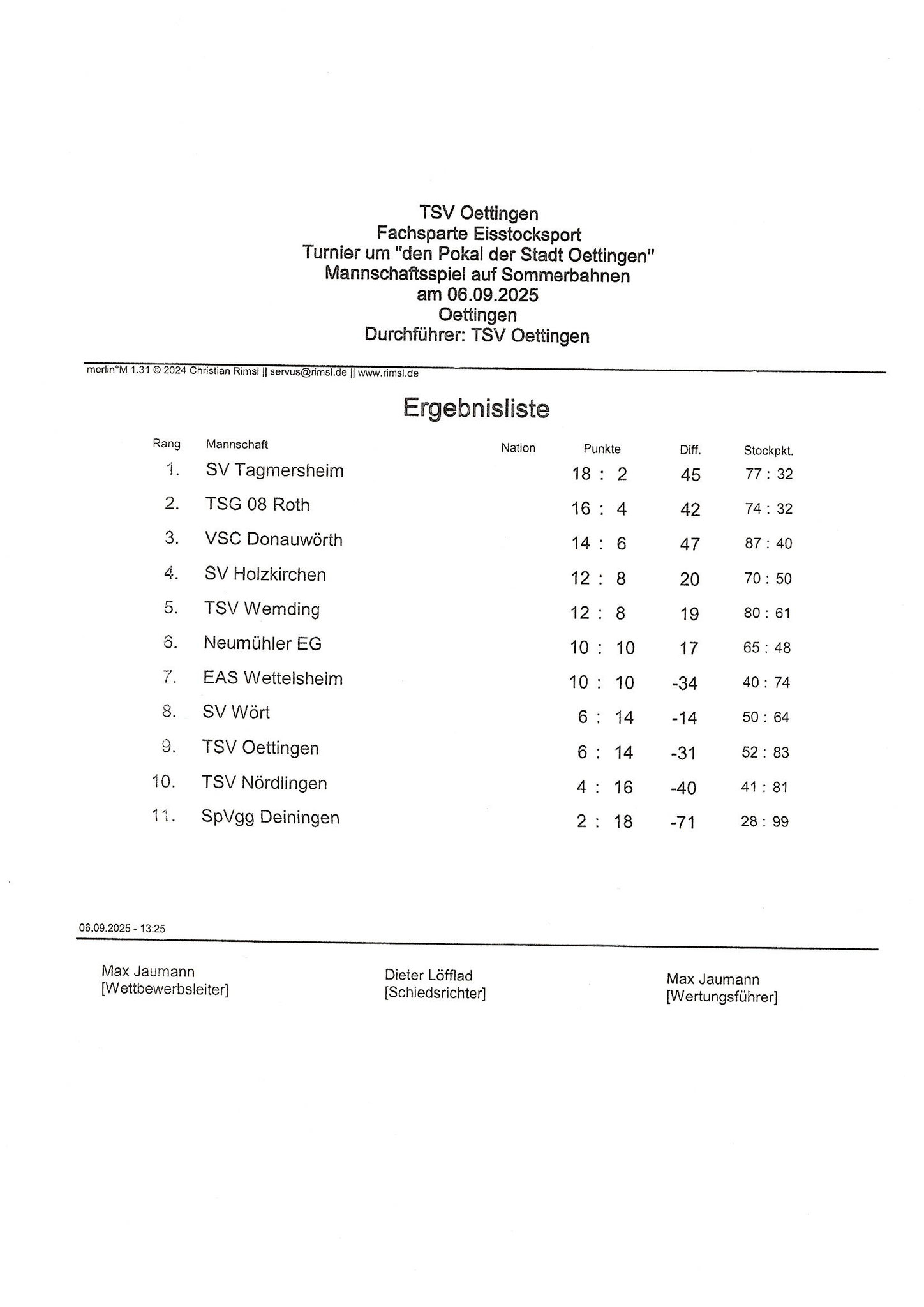 Beim Turnier um "den Pokal der Stadt Oettingen" am 06.09.2025 in Oettingen belegten die Stockschützen der SpVgg Deiningen den letzten Platz.